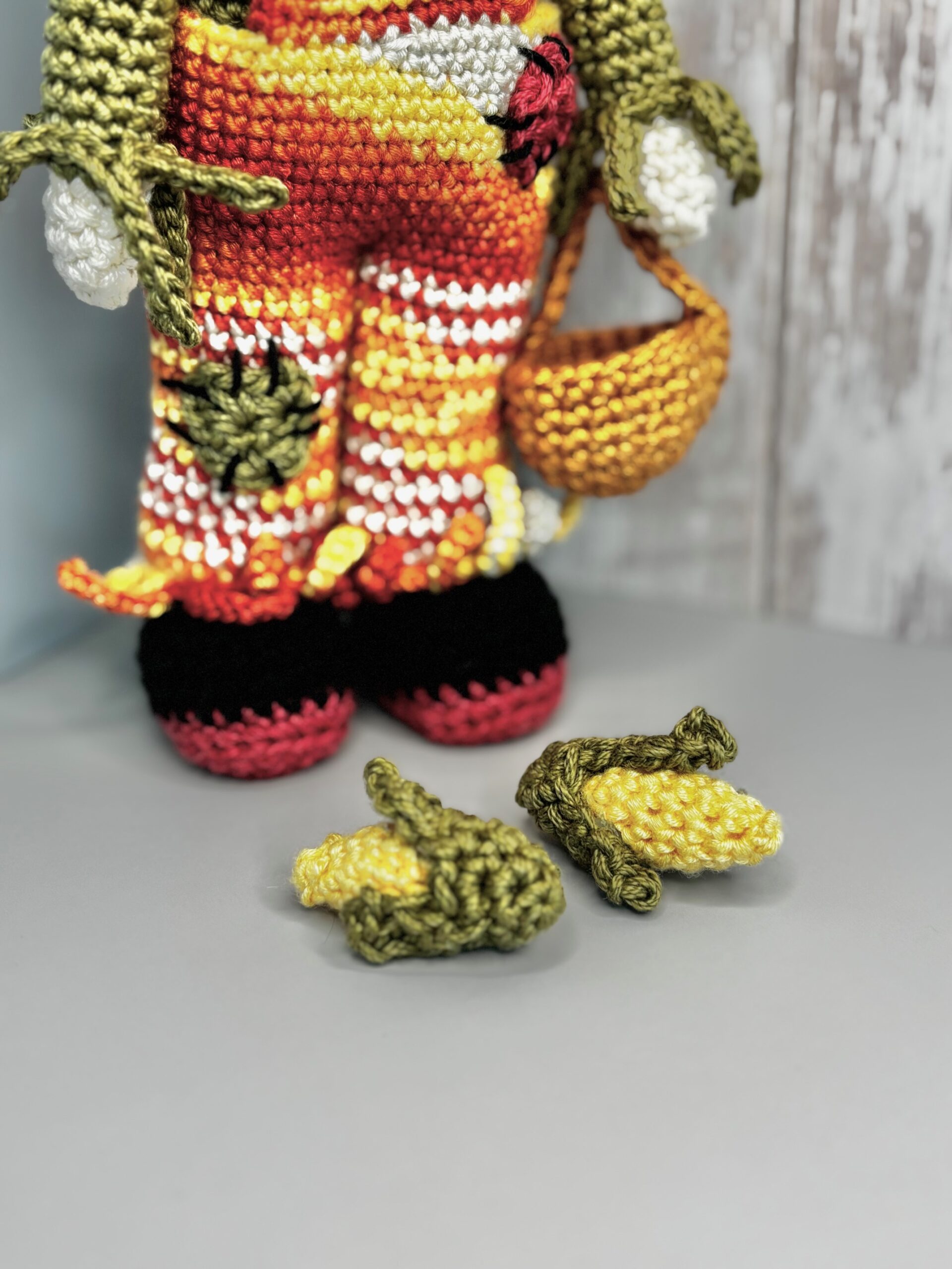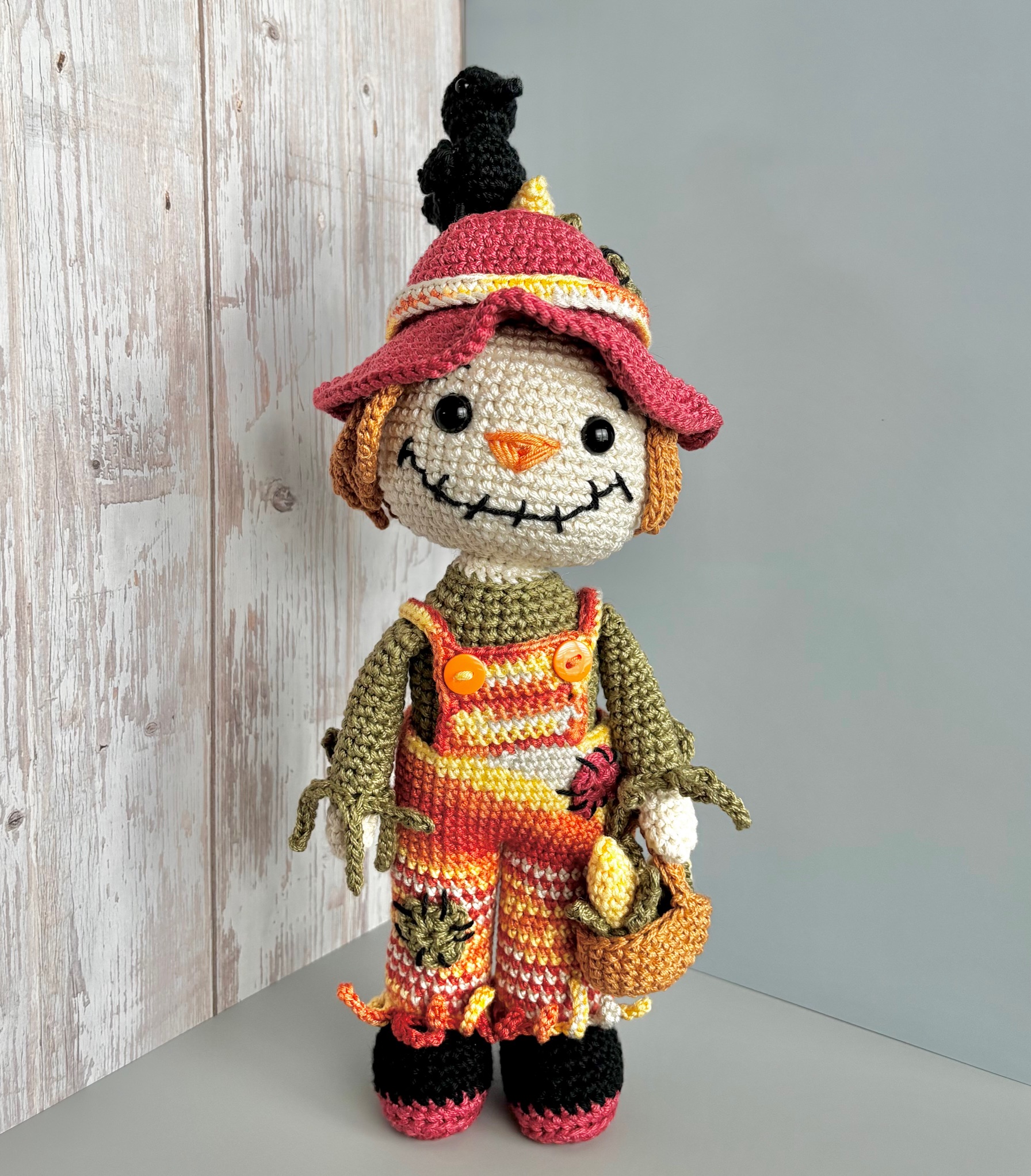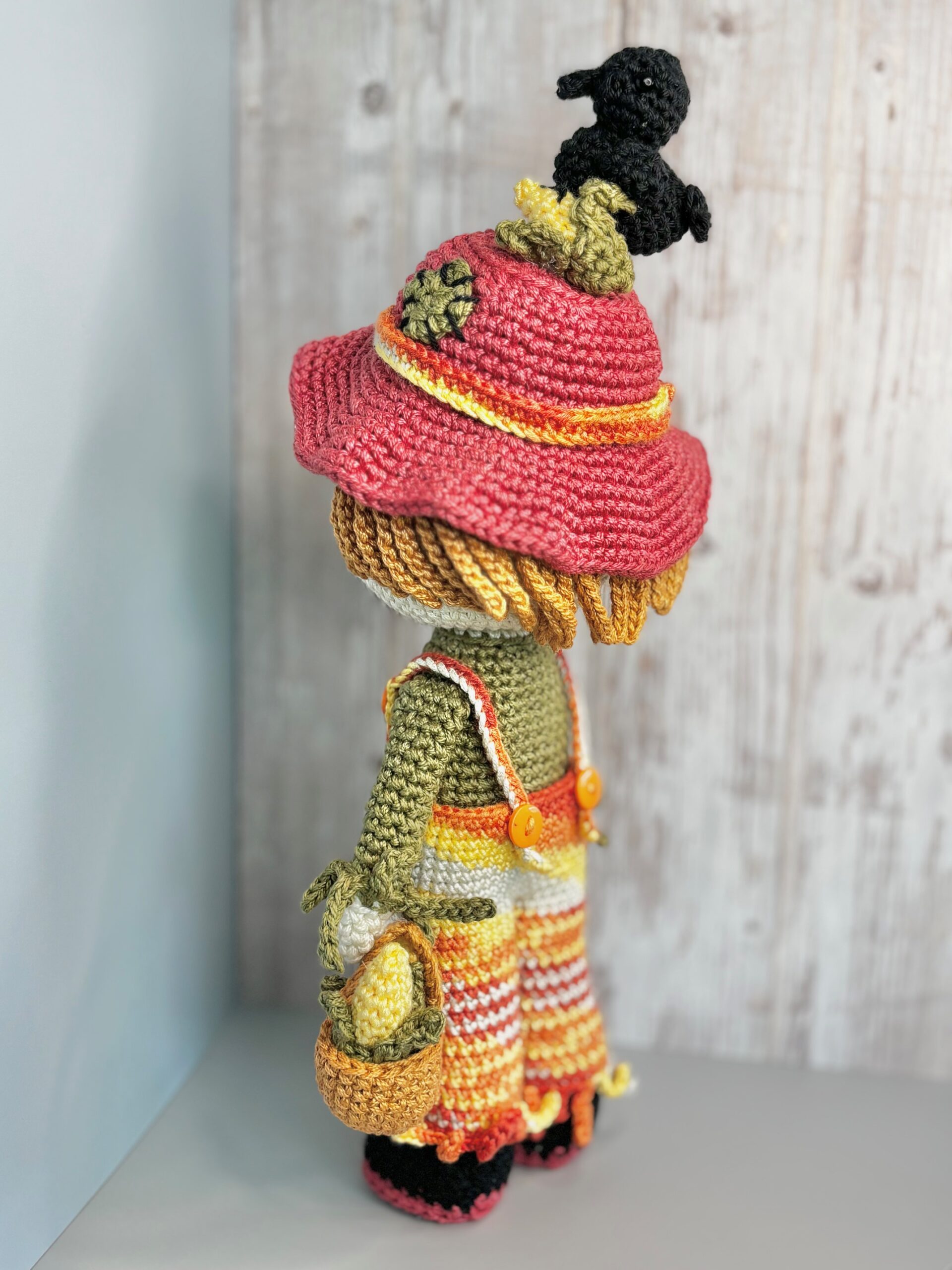 Bring a touch of autumn charm into your home with this adorable no-sew scarecrow amigurumi! Designed for fall lovers and crochet enthusiasts, this pattern is beginner-to-intermediate friendly and requires no sewing of separate parts. The scarecrow features a classic straw hat decorated with a corn cob and a crow, plus a basket holding two more corns — making it the perfect handmade piece for harvest season, Thanksgiving, or cozy fall decor.